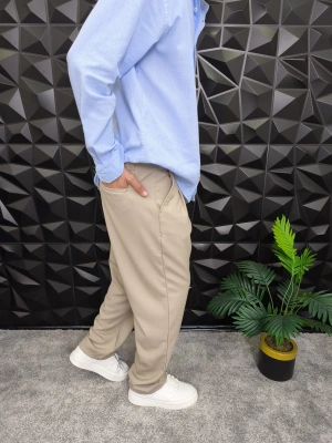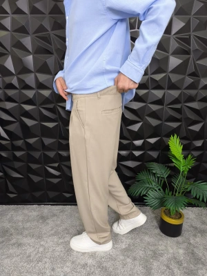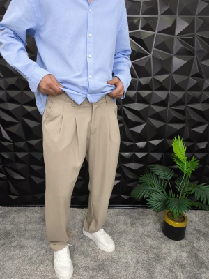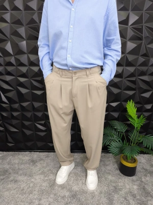 Beli Lastikli Pileli Baggy Kalıp Kumaş Pantolon Bej