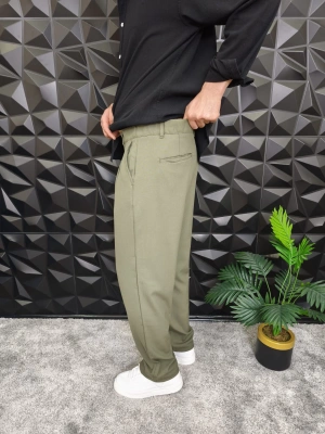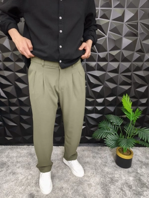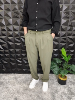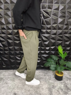 Beli Lastikli Pileli Baggy Kalıp Kumaş Pantolon Haki