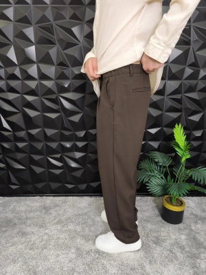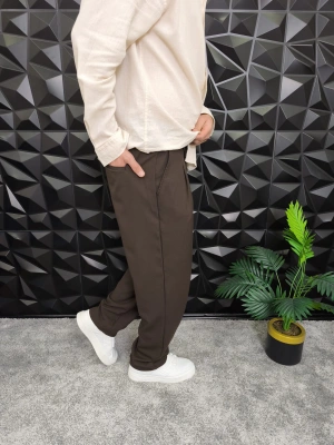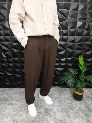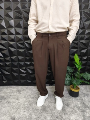 Beli Lastikli Pileli Baggy Kalıp Kumaş Pantolon Kahverengi
