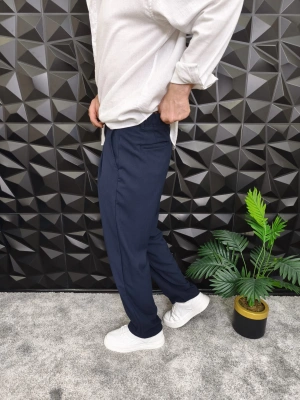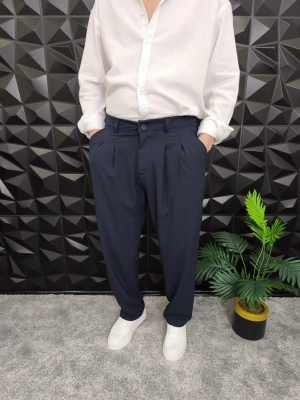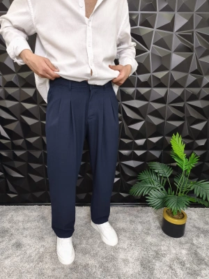 Beli Lastikli Pileli Baggy Kalıp Kumaş Pantolon Lacivert