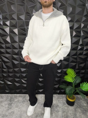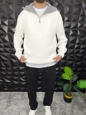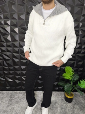 Çift Katlı Yaka Yarım Fermuarlı Örme Kazak Beyaz