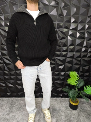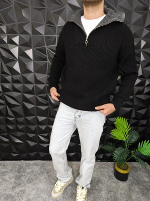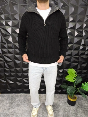 Çift Katlı Yaka Yarım Fermuarlı Örme Kazak Siyah