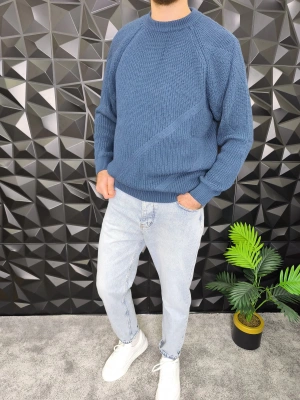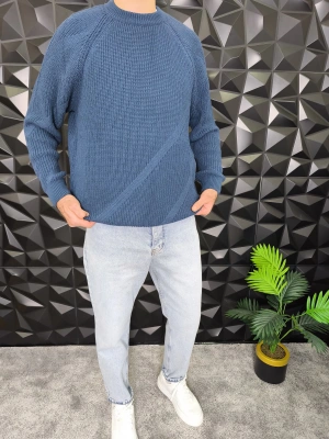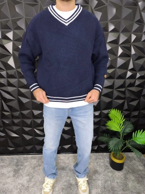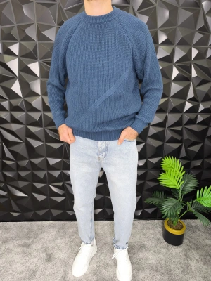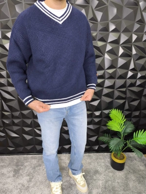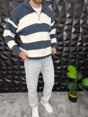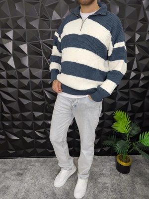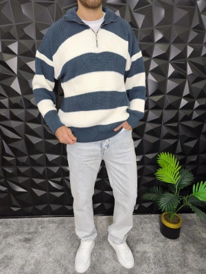 Yarım Fermuarlı Şeritli Örme Kazak İndigo