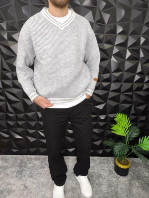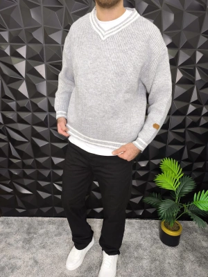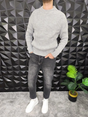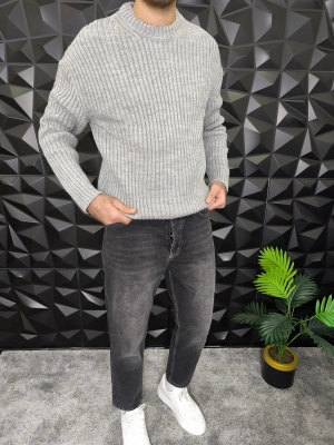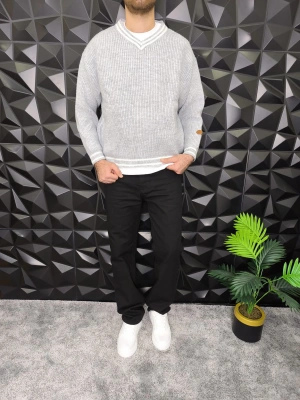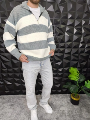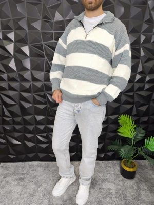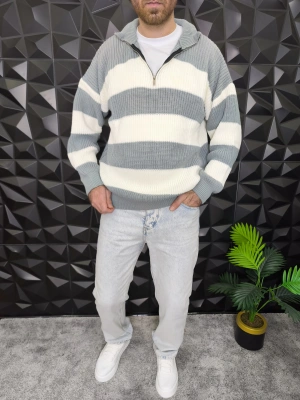 Yarım Fermuarlı Şeritli Örme Kazak Gri