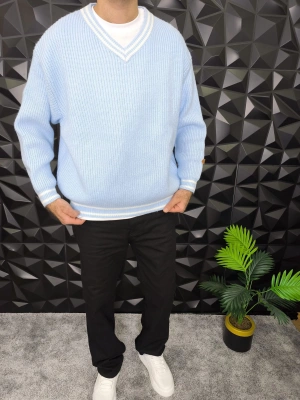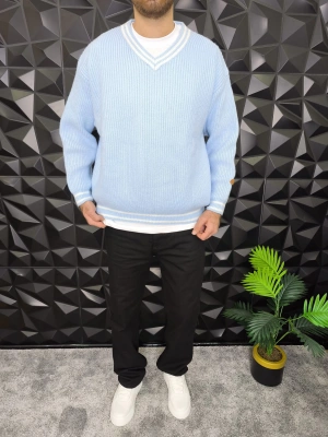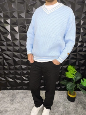 V Yaka Crop Örme Kalın Kazak Bebe Mavi