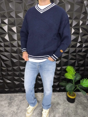 V Yaka Crop Örme Kalın Kazak Lacivert