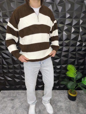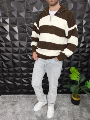 Yarım Fermuarlı Şeritli Örme Kazak Kahverengi