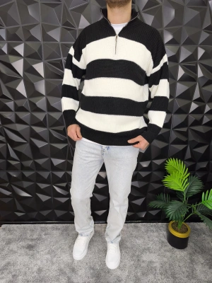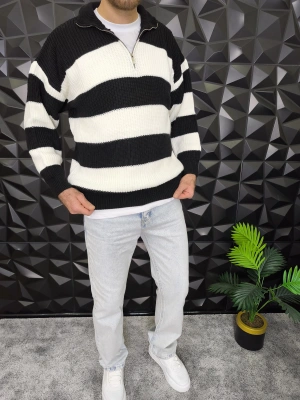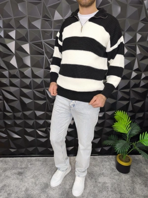 Yarım Fermuarlı Şeritli Örme Kazak Siyah